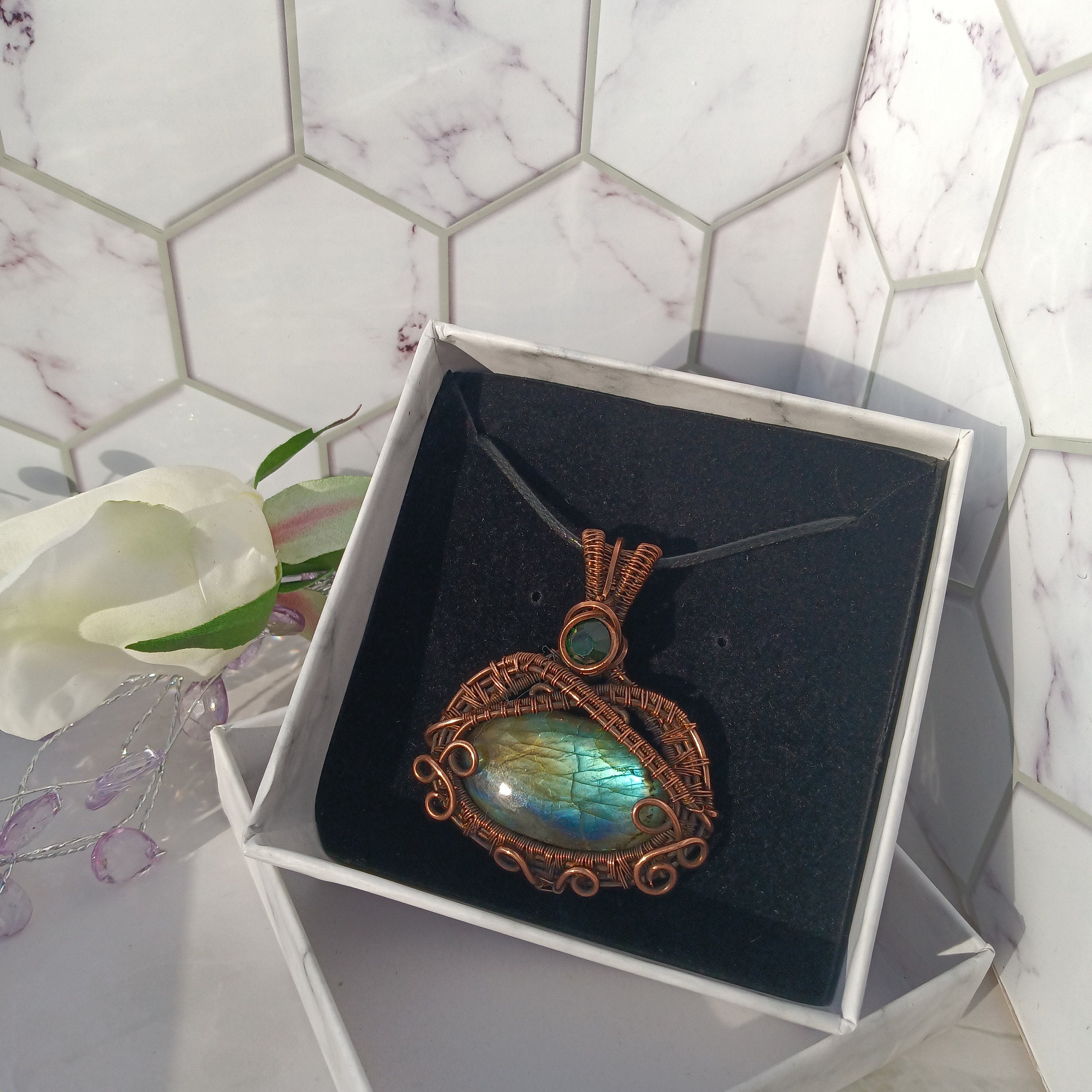 Each stone is carefully picked for luster and color and then the stone inspires the design. A copper wire frame is made and then woven with smaller wire. After the frame is made the stone is attached and then all the extra wire bits are shaped and curled in decorative patterns. Each pendant takes many hours of meticulous bending and shaping, antiquing, and polishing to get the desired look. Truly a unique look and a one of a kind piece.