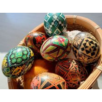 Each egg is carefully selected from our local farms. The design is sketched on with a graphite pencil. A kitzka is held over an open candle flame to melt beeswax to be drawn over those lines. Each color requires a different dye bath, so more colors equals more creation time. The colors are applied in reverse order (light to dark) until the entire egg is coated in beeswax. Then the finished egg is held over candle flame to "reveal" the design. After the egg is dry, a small hole is drilled into the egg to clear our the contents. The egg is then lacquered to protect the design.